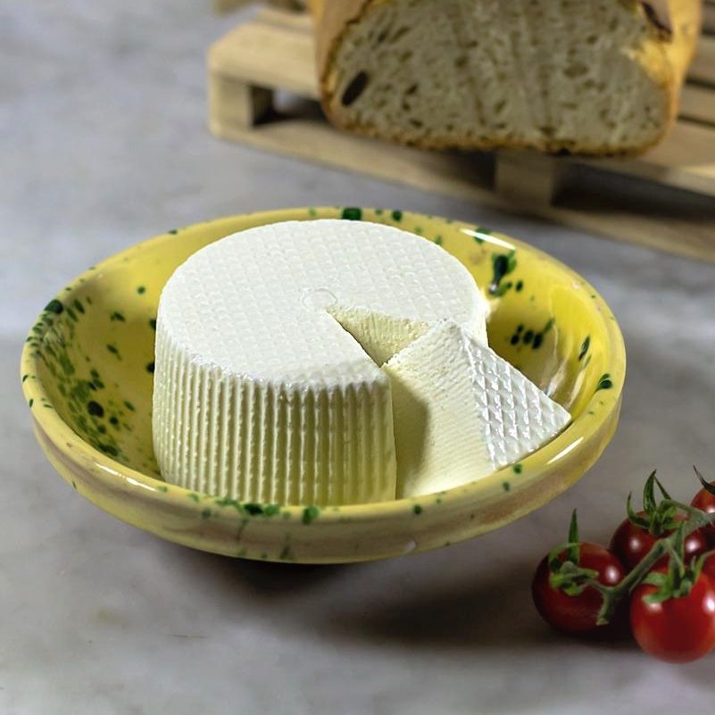 Un po’ più stagionato della ricotta fresca (2/3 giorni), quindi più denso da poter essere tagliato a fette. Accarezzato esternamente con sale.