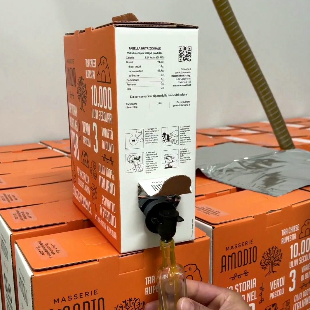 Olio extravergine d’oliva. Un blend perfetto tra gusto e profumi. Le varietà sono: coratina 60%, leccino 15%, ogliarola 20%, e 5% frantoio.